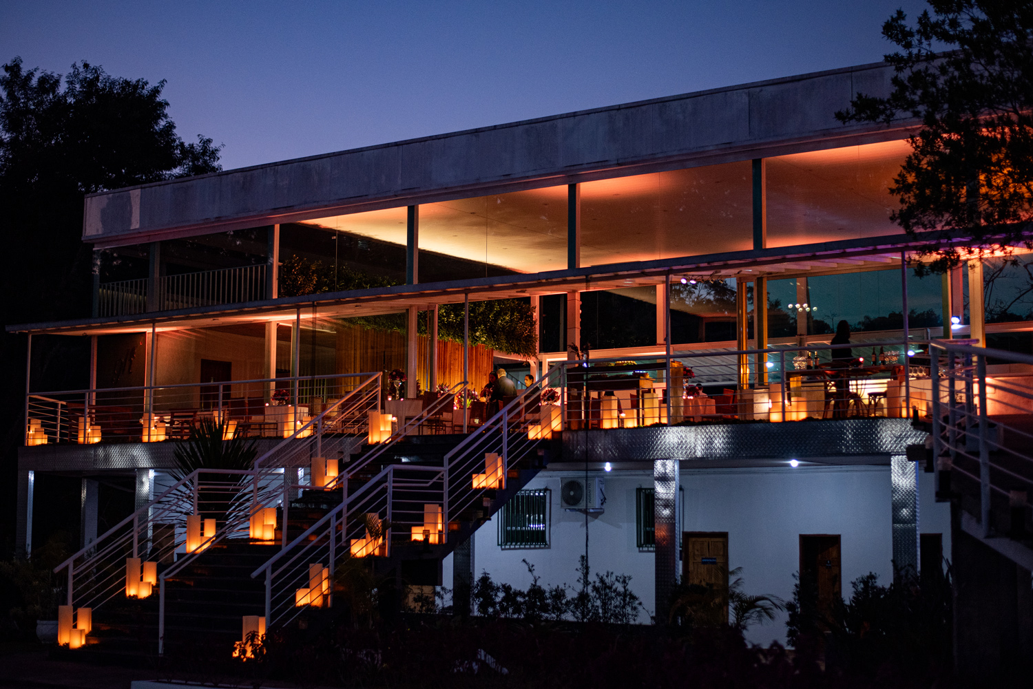 Um salão versátil, ladeado por paredes de vidro: a paisagem verde entra como convidada de honra e faz cada momento virar cenário de cinema.
